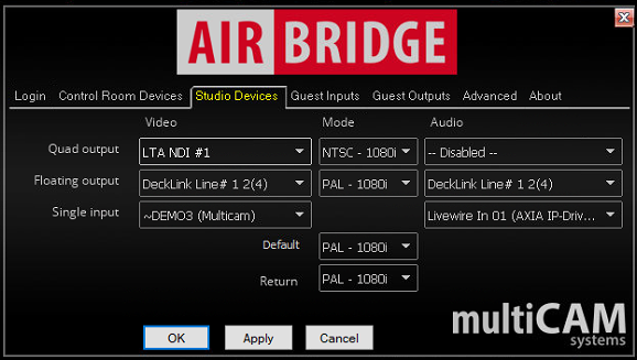 The Studio Devices tab provides the configuration options for how AIR BRIDGE will be used for a given production. It provides options for configuring the following: