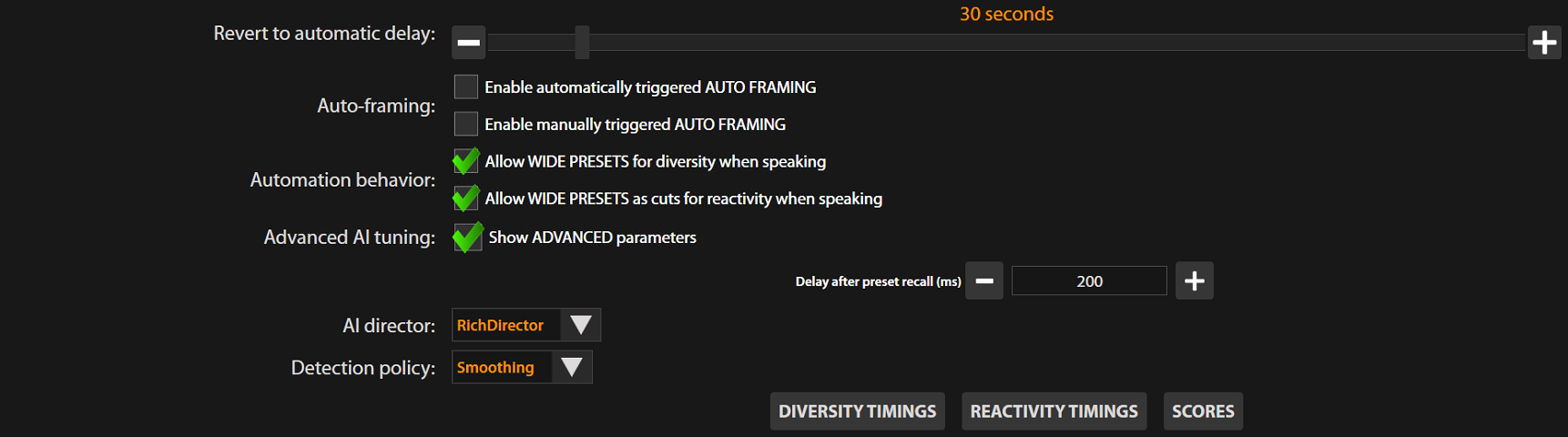 - Diversity timings / Reactivity timings / Scores: We advise against modifying these values. They adjust the filming in detail.