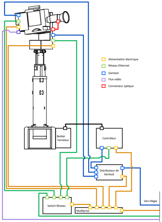 The diagram above shows a possible wiring of Genlock. The first box that generates the signal is located in the control room so that it can be used on other devices. It is connected by an SDI cable to the second box which allows the Genlock to be redistributed on the Head, the Lift and the camera.